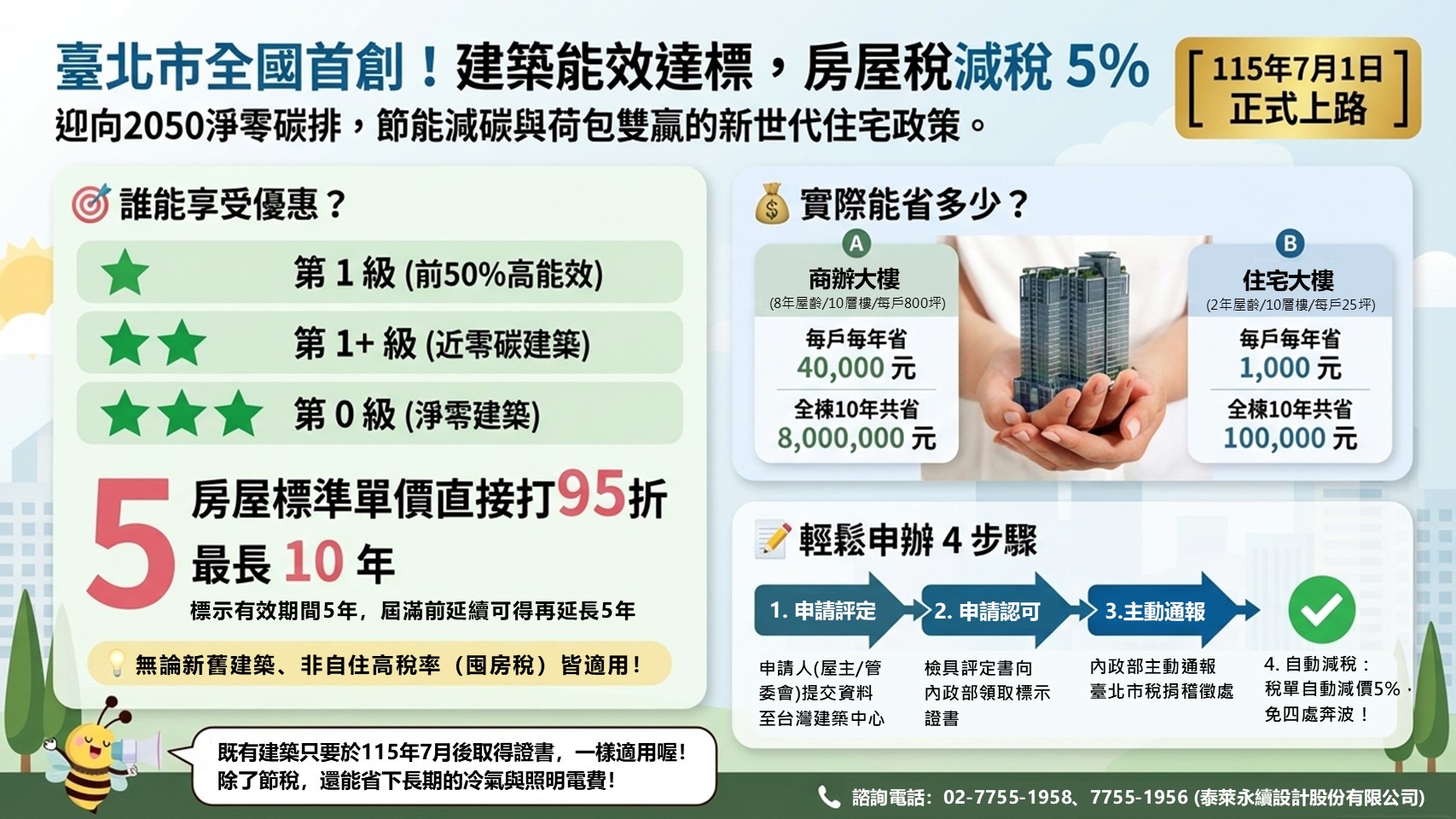 今年,臺北市政府祭出了一項與企業荷包息息相關的新政:自 115 年(2026年)7 月 1 日起,率先全國推出「建築能效房屋稅減免」措施