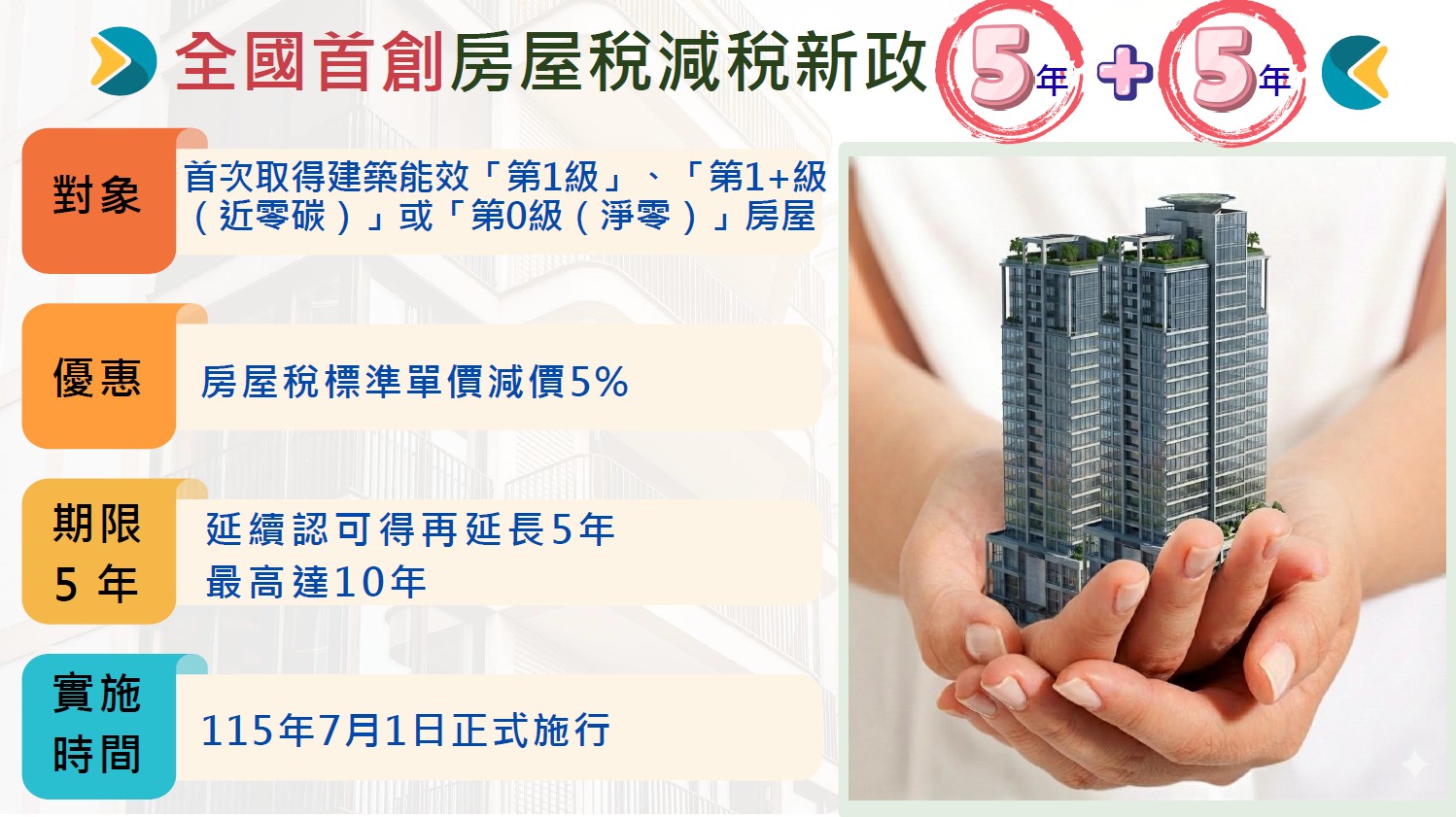 政策劃重點:能效達標,房屋稅最高連降 10 年